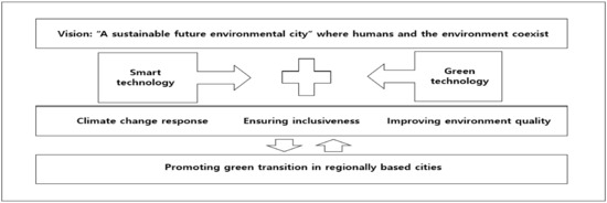As Figure 3 shows, according to a Ministry of Environment press release, the project envisioned a sustainable “future environmental city” where humans and nature coexist [17,58]. In this regard, a future environmental city refers to the transformation of a city into an economically prosperous and green city by increasing climate resilience, using resources and energy efficiently, and minimizing pollutant emissions based on local leadership and resident participation. Here, the transition to a green city is understood as the transition from a growth-driven society to an ecological and environmentally sustainable society.