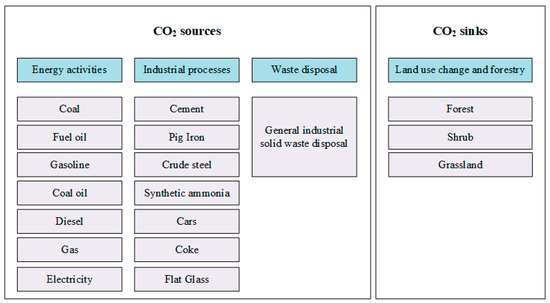 As there are no official statistics on CO2 emissions in Tianjin, this research drew upon the findings of Yang et al. (2023) to calculate the CO2 emissions [45]. The CO2 emissions in the study come from four sources: energy activities, industrial processes, waste disposal, and land-use change and forestry, where CO2 sources are derived from energy activities, industrial processes, and waste disposal and land-use change and forestry are CO2 sinks. The accounting specifics include the following components (Figure 3).