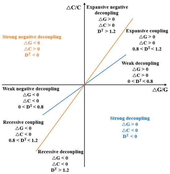 The Tapio decoupling framework categorizes the interplay between environmental pressures and economic expansion into eight distinct types (Figure 4), and according to Tapio (2005) [47], decoupling indicators can be defined as