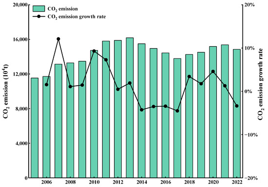 From 2005 to 2022, Tianjin witnessed a rise in CO2 emissions from 115.4 million tons to 148.5 million tons, peaking at 161.86 million tons in 2013. The emissions grew at an average annual rate of 1.84%, with the most significant increase of 12.12% occurring between 2006 and 2007. During 2005–2013, Tianjin’s CO2 emissions showed an upward trend, followed by a decline from 2013 to 2017. This reduction can be attributed primarily to decreased emissions from industrial products and transportation sectors, as illustrated in Figure 5.