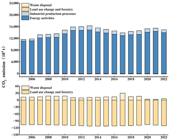 From Tianjin’s sectoral CO2 emission map from 2005 to 2022 (Figure 6), we can see that CO2 emissions from energy activities have been Tianjin’s primary source of CO2 emissions, accounting for more than 90% of CO2 sources yearly. The emissions from industrial production processes rank as the second major contributor, representing approximately 10% of the total emissions. CO2 emissions in energy consumption and industrial production processes are the main reasons for the change in Tianjin’s CO2 emissions. Land-use change and forestry are major carbon sinks, absorbing about 10% of CO2 emissions yearly.