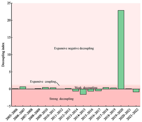 Analyzing the decoupling of CO2 from the economy is crucial for assessing the environmental sustainability of economic development. The annual decoupling states determined during the study are shown in Figure 7. From 2005 to 2022, Tianjin’s economy preserved the continuous growth state, so there was no strong negative decoupling, weak negative decoupling, recessive coupling, or recessive decoupling state. The decoupling state can be analyzed in three stages.