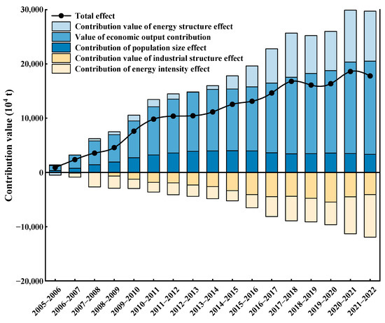 Among the five energy-CO2-emission drivers, population size, economic output, and energy structure positively impact the rise in energy-related CO2 emissions. In contrast, industrial structure and energy intensity have a negative impact, acting as restraining factors. Among them, the industrial structure plays a positive promoting role in individual years, and the energy structure plays a negative inhibiting role in particular years. Generally, the five drivers of energy CO2 emissions contribute positively each year and show an increasing trend. The combination of various factors contributes to the energy CO2 emissions, increasing the energy CO2 emissions in Tianjin yearly. The trends of individual factors’ contribution values and the five factors’ contribution values are shown below (Figure 8). A thorough analysis of each factor’s influence is provided in the subsequent section.