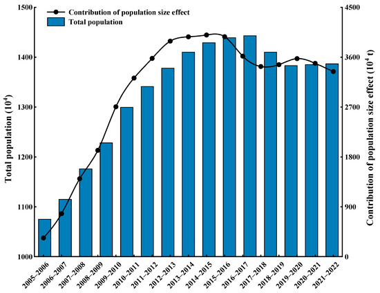 The population-size effect is Tianjin’s third-largest positive driver of CO2 emissions (average annual effect of 28.17 million tons). In the 18 years from 2005 to 2022, the effect of population size on CO2 emissions shows an upward and downward trend, bringing a cumulative effect of 506.98 million tons of CO2, with a cumulative effect of 27% contribution to CO2 emissions. The population of Tianjin shows a trend of rising and then falling, with the population of Tianjin growing from 10.43 million to 13.63 million from 2005 to 2022. As depicted in Figure 9, the growth trend of CO2 emission contribution of population-size effect is consistent with the population growth trend. Population growth determines the increase in CO2 emissions that contribute to the population-size effect, which cannot be controlled in the short term. The “Tianjin Territorial Spatial Master Plan (2021–2035)” limits the population to 20 million in 2035, and the contribution of future population growth to CO2 emissions should not be underestimated.
