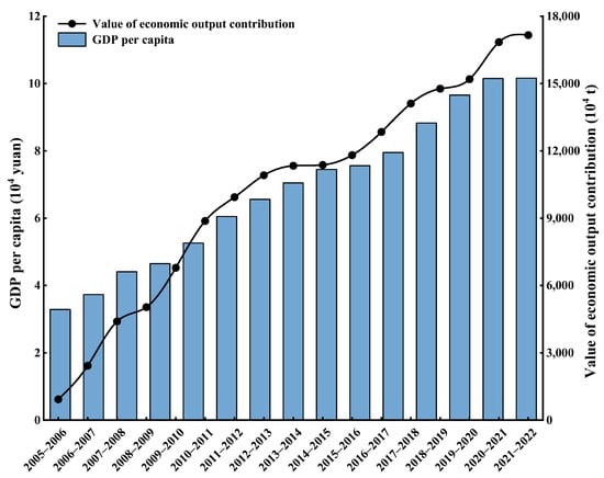 The economic-output effect is Tianjin’s number one driver of CO2 emissions (average annual effect of 97.09 million tons). From 2005 to 2022, the role of economic-output effect on CO2 emissions increased yearly, bringing a cumulative effect of 174.76 million tons of CO2, with a cumulative effect of 94% contribution to CO2 emissions. Tianjin’s economy continued to grow at a high rate year-round, and although the economic growth rate had slowed in the last 20 years, the economic growth rate was almost above 10% in 2015 and before. The high-growth economy has become a major driver of CO2 emissions. As seen in Figure 10, the growth trend in the value of economic-output contribution is consistent with the growth trend in GDP per capita. Achieving sustained economic growth without exacerbating CO2 emissions necessitates robust technological advancements. These improvements should aim to reduce the economy’s reliance on resource-intensive consumption and substantial investment. Additionally, it is crucial to bolster the capacity for scientific and technological innovation to become a driving force for economic expansion. In this regard, Tianjin has issued the “Tianjin Three-Year Action Plan for Science and Technology Innovation (2020–2022)” to enhance independent-innovation and original-innovation curation capacity and promote green economic growth.