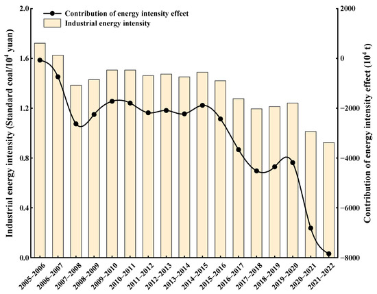 From 2005 to 2022, the suppression of CO2 emissions by decreasing energy intensity showed an increasing trend (average annual effect of negative 28.55 million tons), bringing a cumulative reduction of 513.85 million tons and contributing 28% to the cumulative effect of CO2 emissions. As depicted in Figure 12, the decline in the contribution of energy-intensity effects is the reduction rate of industrial-energy intensity. Therefore, further improvement of the regional technological level in Tianjin will bring a more obvious reduction effect.