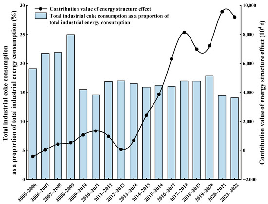 Industrial coke consumption as a proportion of industrial energy consumption and contribution value of energy-structure effect in Tianjin.