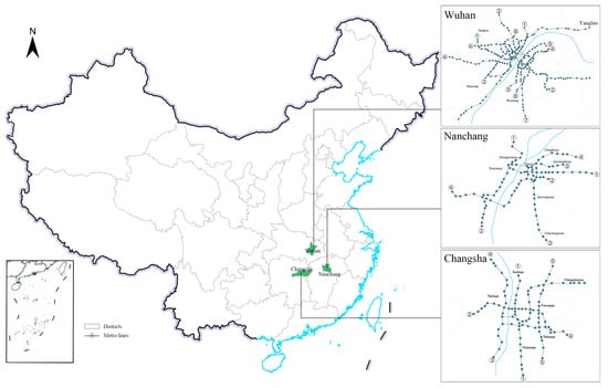 In order to test the new nodal place model and prove its validity, the city cluster in the middle reaches of the Yangtze River is selected as the research center, but since only three cities, Wuhan, Changsha and Nanchang, have metro transportation network systems, only three cities are selected for applying the model in this paper. Among them, Wuhan and Changsha are megacities in China, and Nanchang is a large city in China (Figure 4). These three cities share some similarities in terms of metro distribution and geographic features as all their metro lines crosses rivers. Wuhan’s metro lines crosses the Yangtze River, Changsha’s crosses the Xiang River, and Nanchang’s crosses the Gan River, as shown in Figure 3. Therefore, these cities are chosen as representatives for the comparative analysis of TOD types for midstream cities along the Yangtze River. Additionally, while the fundamental TOD of all three cities is typical, there are still some variances between them, especially when it comes to the size of the metro lines, the composition and capacity of the network, and the number of hours that the metro operates (Table 3). Therefore, studying the comparative analysis of TOD in the city clusters in the middle reaches of the Yangtze River is an important comparative case. Understanding TOD concepts and classifications better may be achieved by comparing the different TODs in these cities.