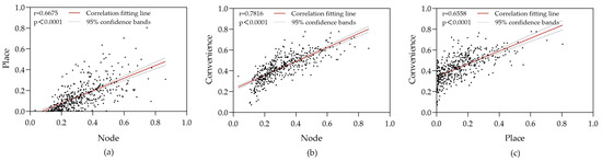 Scatterplot of node, place, convenience correlation: (a) node and place correlation; (b) node and convenience correlation; (c) place and convenience correlation.