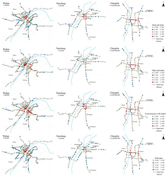 The pairwise distribution of sub-index values is shown in Figure 5. The distributions in Wuhan and Changsha are more dispersed, while Nanchang’s distribution is more concentrated. In terms of the ‘node–place’ relationship, Wuhan’s ‘node’ are significantly larger, while Nanchang’s ‘place’ are larger. In the Yangtze River Midstream City Cluster, more than half of metro stations have higher ‘node’ ratings than ‘place’ ratings. Nearly all metro stations gave ‘convenience’ a higher rating than ‘place’.