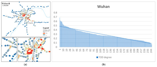 (a) Metro station area TOD heat map and (b) TOD index of metro station area in Wuhan city.