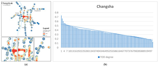 (a) Metro station area TOD heat map and (b) TOD index of metro station area in Changsha city.