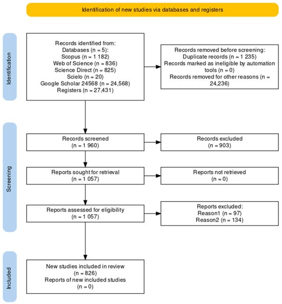 To obtain a comprehensive view of the literature, which would come as close as possible to the total sampled universe of publications on climate justice in the world, a search protocol was drawn up for the systematic review following the Prisma principles (https://www.prisma-statement.org/, accessed on 19 September 2024) []. The aim was to identify and compile literature on the subject to create a theoretical basis for analyzing from which perspectives climate justice is being worked on in the countries that make up the Global North and South. This action made it possible to develop the axes of the current literature and visualize a matrix in which this theme is approached around the world (Table S1).