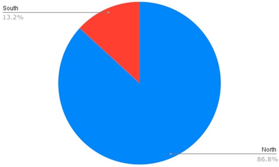 The total number of papers obtained after using the exclusion and inclusion criteria totaled 826 and dealt with climate justice, of which 717 (86.6%) belonged to countries in the Global North and 109 (13.2%) to countries in the Global South (Figure 2). The criteria used to divide and classify the sample was the country of the work institutions of the first authors of each material analyzed. This result adds to that of other systematic reviews on climate justice, in which the majority of authors focus on countries in Europe and North America [,,,,].