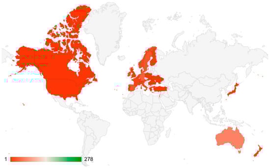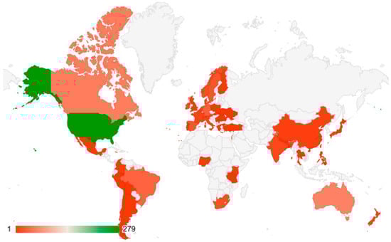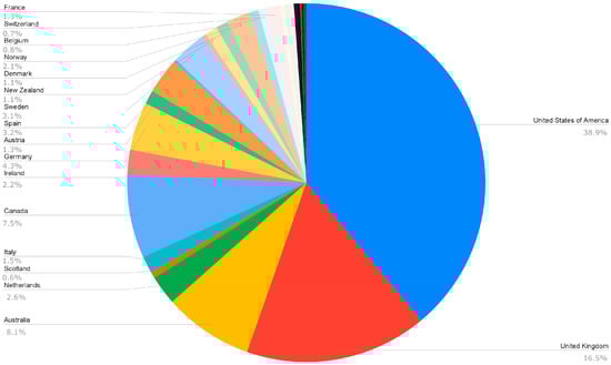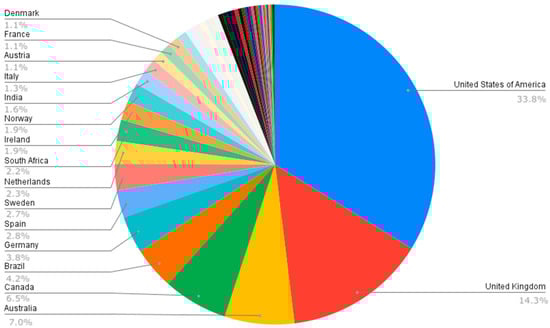 The concentration of publications in the Global North was expected, and it is located in the continents of North America, Europe, and Oceania, headed by the United States of America, the United Kingdom, and Australia, which are also countries with the highest number of publications (38.9%, 16, 5%, and 8.1% of the total, respectively) (Figure 7 and Figure 8).