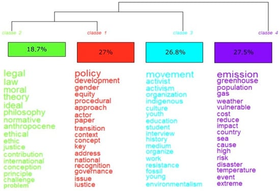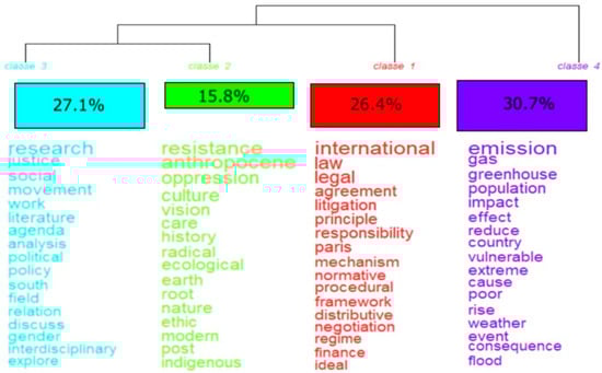 Four classes of grouping were reached when using the analysis of descending hierarchical classification (CHD) in the content of the abstracts, titles, and texts of the works (Figure 6). The objective here was to expose similarities and differences in content between the groups. The main themes found were international legislation (Class 1), resistance, oppression, and Anthropocene (Class 2), research and social movement (Class 3), and greenhouse gas emissions (Class 4).