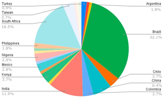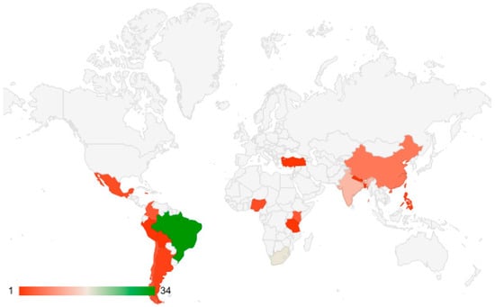 Distribution of work on climate justice (2000–2021) among countries belonging to the Global South. Source: Web of Science, Scopus, Scielo, ScienceDirect, and Google Scholar databases. Elaborated by the authors.