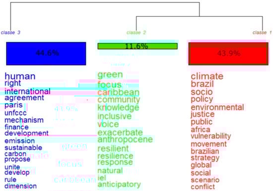 In the similarity analysis, three classes of work groups were created to make the analysis clearer and with time-process marks. Class 1 has, as its central axis, a relationship between climate and socio-environmental policies, Class 2 focuses on knowledge, and Class 3 works on the issue of human rights and the Paris Agreement (Figure 12).