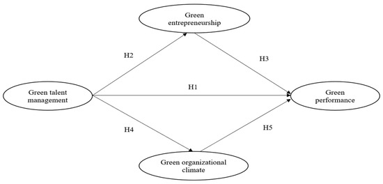 GE cultivates a corporate culture focused on environmental stewardship. This culture motivates employees to embrace sustainable practices and fosters a more dedicated and engaged workforce, thereby improving GP [76,77]. Involving employees in green initiatives and motivating their involvement in sustainability efforts can result in more creative solutions and enhanced GP. For example, sustainability programs led by employees or green teams can introduce effective practices and technologies [5,78]. GE frequently entails embedding sustainability objectives into the core business strategy. By incorporating environmental goals into strategic planning, entrepreneurs ensure that all business operations and decisions are aligned with GP targets. This alignment improves the organization’s capacity to achieve its GP goals effectively [17,79]. Therefore, the following hypothesis is suggested: