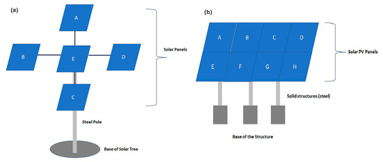 In Figure 1a, it is clearly shown that the solar panels are attached to a single pole-like structure, which is further attached to a small base. However, in a conventional rooftop or ground-mounted solar photovoltaic system, all the solar panels are attached to multiple solid structures, as shown in Figure 1b, which covers a larger area [16].
