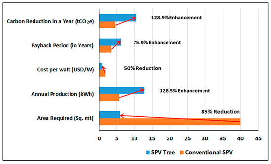 Based on the simulation analysis, it was outlined that the conventional rooftop SPV system occupied more space in terms of installation, as it is horizontally spread across the roof’s available area. However, the Marigold-type rooftop SPVT system was installed vertically using a steel pole, and its branches hold the solar modules. Thus, the area required for its installation is much smaller than the conventional rooftop SPV system. The overall area occupied in terms of installation by the conventional system is ~40 Sq.mt, whereas the area occupied by the rooftop SPVT is ~6 Sq.mt, which is around 85% less than the conventional system. Moreover, when a typical SPV is built on a rooftop, access to the available space on the roof becomes obstructed. However, in the case of an SPVT, this discomfort is insignificant. The space beneath a rooftop SPVT can easily be converted for other purposes, such as storage and gardening.