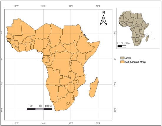This study focuses on Sub-Saharan Africa (SSA) (Figure 1), a vast region defined by the borders of more than 40 countries in the south of the Sahara Desert. SSA encompasses a wide range of climatic conditions, from humid equatorial regions to arid areas in the north and south. Rainfall and temperature patterns vary significantly across this diverse region. Countries within the 10° N–10° S latitude, such as those in Central Africa and the Ethiopian Highlands, receive over 1500 mm of annual rainfall, while other parts of SSA receive less than 500 mm. Temperature variation is mainly influenced by elevation, with higher altitude regions like the Great Rift Valley and southern Africa experiencing cooler average temperatures of around 15 °C, while equatorial regions average 25 °C, and areas near the Sahara can reach up to 30 °C [9,15].