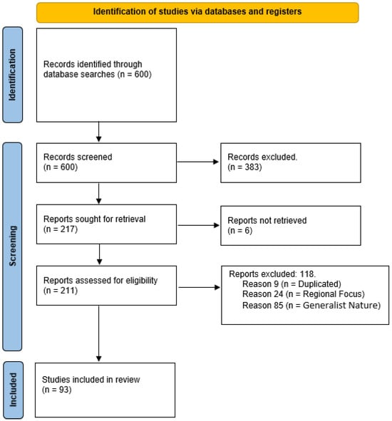 In this study, a structured approach was used to conduct the systematic review, guided by the PRISMA 2020 framework (Figure 2). It systematically outlines the process undertaken, starting from the formulation of a robust search strategy to the selection of relevant databases, criteria for inclusion and exclusion, and the approach for assessing the quality of the studies included. The electronic search was conducted across the following databases: Science Direct, Google Scholar, PubMed, and Web of Science. Inclusion and exclusion criteria were carefully followed for article selection. As a result, a total of 93 studies, ranging from 2010 to 2024, were included in this review after the screening and assessment process based on predefined eligibility criteria.