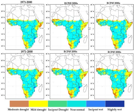 In West Africa, Ajayi [35] utilized SPI and SPEI to project drought trends under RCP4.5 and RCP8.5 scenarios. The projections indicate that areas north of 12° N will be hotspots for mild and moderately dry events, while the southern part will experience pronounced severe and extreme dry events under both RCPs. Notably, SPEI projects a significant decreasing trend in drought events over the three climatic zones and almost all seasons under the RCP8.5 scenario, illustrating a shift towards drier conditions.