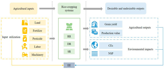 The objectives of this study were threefold: (1) to develop an EE framework that concurrently considered input utilization, agricultural outputs, and environmental impacts to comprehensively assess the rice-cropping systems; (2) to employ non-efficiency decomposition methods to identify factors contributing to EE losses within the rice-cropping systems; and (3) to offer specific policy insights aimed at optimizing and promoting rice-cropping systems based on the findings. A primary contribution of this study is the advancement of an integrated framework that comprehensively considers the input utilization, agricultural outputs, and environmental impacts, distinguishing it from previous research efforts. This comprehensive approach enhances our understanding of how rice-cropping systems can be optimized to meet future food demands while minimizing environmental impacts and enhancing farmer welfare, offering a model for sustainable agricultural practices worldwide.
