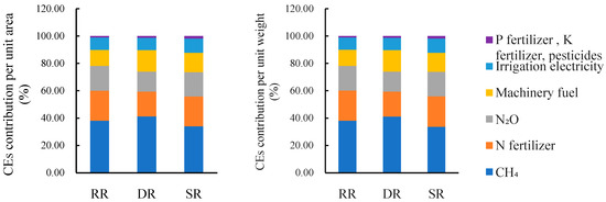 The contributions of various sources to the CEs of the three rice-cropping systems are detailed in Figure 2. The CE contribution structures from different sources were generally consistent across the three rice-cropping systems, regardless of whether the unit area or unit weight was considered. The CH4 from rice fields was the highest contributor to the CEs of rice production, followed by nitrogen fertilizer, rice field N2O, machinery fuel, and electricity for irrigation. A slight difference was observed in the DR system, where the contribution of machinery fuel exceeded that of the rice field N2O emissions, although the values were very close. Collectively, these five key sources accounted for more than 98% of the total CEs. The contributions of phosphorus fertilizer, potassium fertilizer, and pesticides to the CEs in rice production were relatively low.
