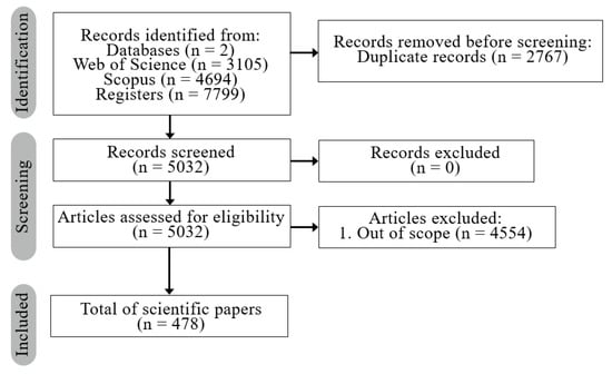 Articles published in periodicals were the scientific documents of interest. Literature reviews, meta-analyses, technical notes, books (including chapters), conference papers, and other documents were excluded throughout the acquisition process. The search yielded 7799 results. We merged the articles from both databases and removed the duplicates using the Bibliometrix 4.1.3 package implemented in R 4.3.2 (R Core Team 2023) [], resulting in 5032 records. Titles, keyword list, and abstracts were manually reviewed to ensure relevance to the themes of energy theft detection and load profiling in smart grids. Articles focusing on unrelated topics, such as industrial energy management or non-residential load profiles, were excluded. Consequently, the final dataset comprised 478 documents. In order to organize and visualize this process, the adapted PRISMA (Preferred Reporting Items for Systematic reviews and Meta-Analyses) 2020 flow diagram shows, in Figure 1, the flowchart of the aforementioned task [].