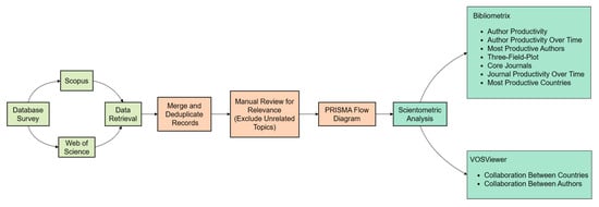 Finally, to address Research Question 5, the following were constructed using VOSViewer 1.6.20: a research field structure in the collaboration networks form and maps of authors and countries with temporality information based on cocitation data []. Figure 2 shows the entire methodological procedure.
