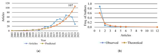 (a) Annual productivity of articles. (b) Author productivity according Lotka’s Law.