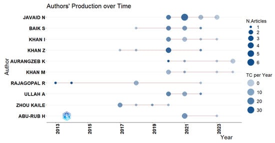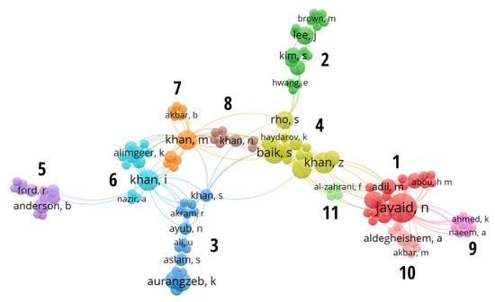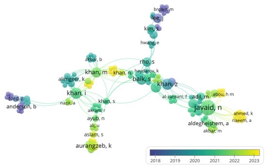 The collaboration network of the authors is illustrated in Figure 11, where Nadeem Javaid (“javaid, n”) is the most productive author in the main group. The analysis of the co-authorship network using VOSviewer revealed a notable pattern in the relationships between the clusters. Specifically, Cluster 1 has a considerable number of connections with Clusters 4, 9, 10, and 11. This observation suggests a high degree of intellectual or collaborative proximity between the researchers within these clusters, indicating potential interdisciplinary interactions or thematic overlaps. Such a finding is significant, as it underlines the key role of Cluster 1 in bridging research efforts across multiple thematic areas, thereby enhancing the overall cohesion and integrative nature of the research network. Figure 12 illustrates the same network, now with a termporality manner (Appendix K).