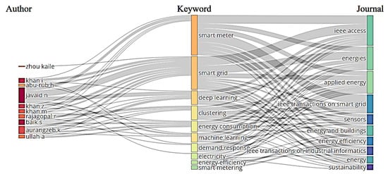 In this plot, it is possible to see that Nadeem Javaid, the most productive author in the set of detected articles (see Table 1), focused his publications in IEEE Access, and his articles were directed in deep learning techniques applied in a smart grid context in order to understand the energy consumption data obtained from smart meters. Note that Journal Sustainability is on the top 10 journals, indicating that this journal can be considered in future submissions if the article adheres to the SDGs.