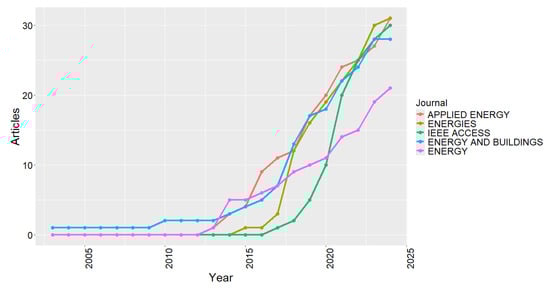 Only Energy and Buildings published articles related to the topic mentioned above between 2003 and 2012. However, from the moment that other journals started to accept and publish articles on this topic, Energy and Buildings lost the lead to the Energy journal in 2014 and briefly regainined the lead between 2018 and 2019. Another point that should be noted is the rapid speed of production in journals Applied Energy, Energies, and especially IEEE Access, the first article of which was published in 2017. It is worth mentioning that this is a new topic, with an exponential increase in articles published since 2018.