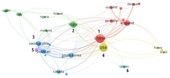 Collaboration between countries. A circle’s color is determined by the cluster to which it belongs (1–6).