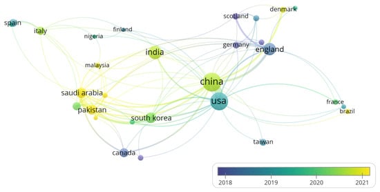 It is important to note that Pakistan and Saudi Arabia have a MCP value higher than the SCP, indicating s a strong international collaboration in terms of scientific production in this topic, including collaborations between them, China, and USA. Figure 10 shows the same network as in Figure 8, but with nodes in different colors where the blue tone represents the countries with articles published for a more extended period of time than those in yellow. For instance, England and the USA have been publishing for longer than China, which in turn has been publishing for longer than Pakistan and Saudi Arabia.