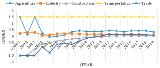 Trends of decoupling index changes for five national economic sectors in Anhui Province from 2000 to 2019.