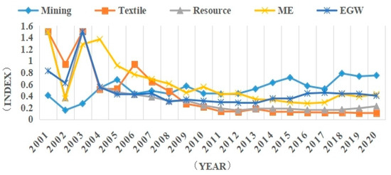 While different industries depend on various specific energy sources, industrial sectors primarily consume coal and oil resources. Among these, mining, resource processing and EGW were the chief consumers of coal and oil, whereas the ME and textile sectors gradually reduced their dependence on these resources, increasingly relying on electricity instead.