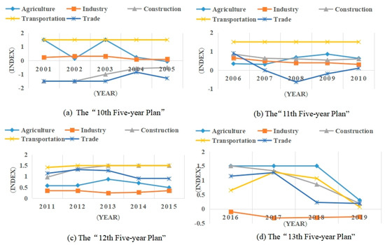 Trends of DAIs of five national economic sectors in each period.