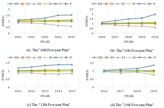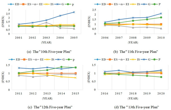 During the years 2001–2005, the EDE experienced substantial growth, with annual rates of 6.6% in the national economic sectors and 17.9% in specific sectors. This underscored the EDE as the primary driver of carbon dioxide emissions, while the ECI emerged as the principal inhibitory factor during the observed periods across the relevant economic sectors. The ECI declined from 0.88 and 1.01 in 2001 to 0.58 and 0.66 in 2005, reflecting average annual reduction rates of 7.8% and 8.2%, respectively, as its inhibitory effect continued to strengthen (Figure 6 and Figure 7). Conversely, the changes in the ISS, ES, CEE, and CP were relatively minor, exerting minimal influence on the carbon dioxide emissions.
