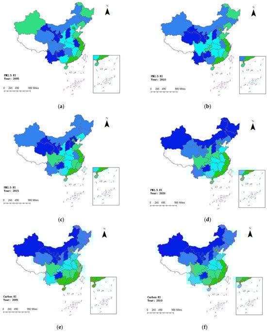 In this paper, a quantile classification is used to describe the pollution intensity and carbon dioxide intensity of Chinese provinces in 2005, 2010, 2015, and 2020 in a hierarchical manner, with a total of five categories, where the color of the markers changing from green to blue implies that a province is at a higher grassroots level of air pollution or carbon dioxide intensity in the country as a whole (Figure 2). From the perspective of China’s four major economic regions, the eastern and central regions show a tendency to move towards the lower end of the scale in terms of both air pollution and carbon intensity, while the western and northeastern regions show the opposite.
