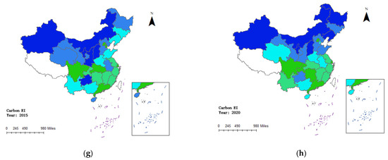 Classification maps of PM2.5 intensity and carbon intensity in various provinces of China. (a–d) are the classification charts of PM2.5 emission intensity in 2005, 2010, 2015, and 2020, respectively, while (e–h) are the classification charts of carbon emission intensity in 2005, 2010, 2015, and 2020. A bluer color indicates a higher pollutant emission intensity and a greener color indicates a lower pollutant emission intensity.