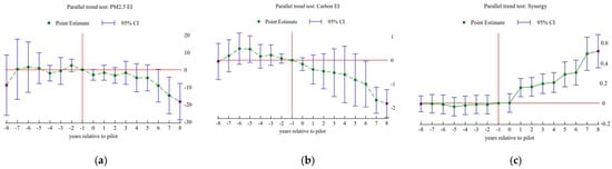 Parallel trend test for PM2.5 emission intensity (a), carbon intensity (b), and synergy between the two (c).