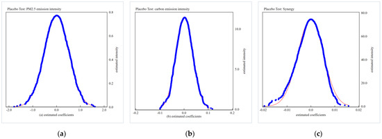 Placebo test results for 1000 randomized samples, where (a) is the sampling test result for PM2.5 emission intensity, (b) is the sampling result for carbon intensity, and (c) is the sampling result for synergy.
