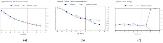 The SCM introduced by Abadie [85] and widely used in policy evaluation involves leveraging data from a control group to create a counterfactual scenario for the experimental group in the absence of policy intervention. The treatment effect can be estimated by comparing the experimental group with the synthetic control group. Figure 5 presents the fitted graphs of PM2.5 intensities, carbon emission intensities, and synergy for the actual experimental provinces (i.e., CEDP pilot provinces) and synthetic control provinces, respectively. The vertical line in the figure denotes the current period when the pilot provinces initiated CEDP implementation, with the left and right sides representing the periods before and after implementation, respectively. The horizontal axis indicates the period during which the pilot provinces implemented the CEDPs. Before policy implementation, the clean energy demonstration and synthetic control provinces exhibited a close fit with similar trends. However, following policy implementation, the PM2.5 and carbon emission intensities of the real experimental provinces gradually decreased compared to those of the synthetic control provinces, and the synergy between the two increased significantly. This indicated that CEDP implementation led to a reduction in PM2.5 and carbon emission intensity in the pilot provinces when compared with the non-pilot provinces.