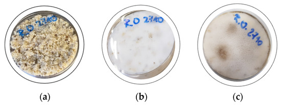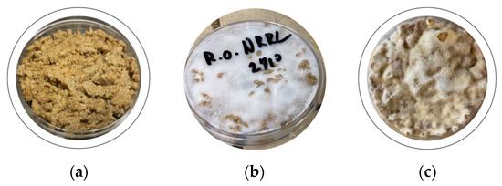 Fermentation stages of tempeh from linseed cake inoculated with R. oligosporus NRRL 2710. (a)—before fermentation; (b)—24 h fermentation; (c)—48 h fermentation.