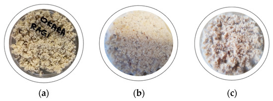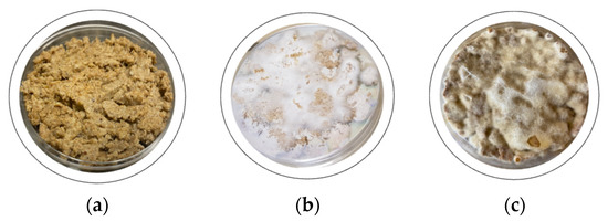 Fermentation stages of tempeh from okara inoculated with R. oligosporus NRRL 2710. (a)—before fermentation; (b)—24 h fermentation; (c)—48 h fermentation.