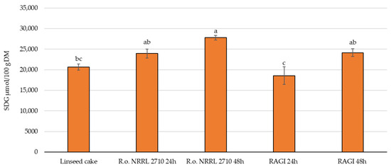 The content of secoisolariciresinol diglycoside in the linseed products. R.o. NRRL 2710—Rhizopus oligosporus NRRL 2710. RAGI—starter Ragi tempeh. 24 h and 48 h—fermentation time in hours. Averages marked with different letters differ significantly (p < 0.05, Tukey test).